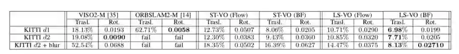 图6 在模糊KITTI d2序列的四种架构的性能。 ST和LS-VO网络之间的性能差异很大。 出于轴刻度的原因,已省略VISO2-M。