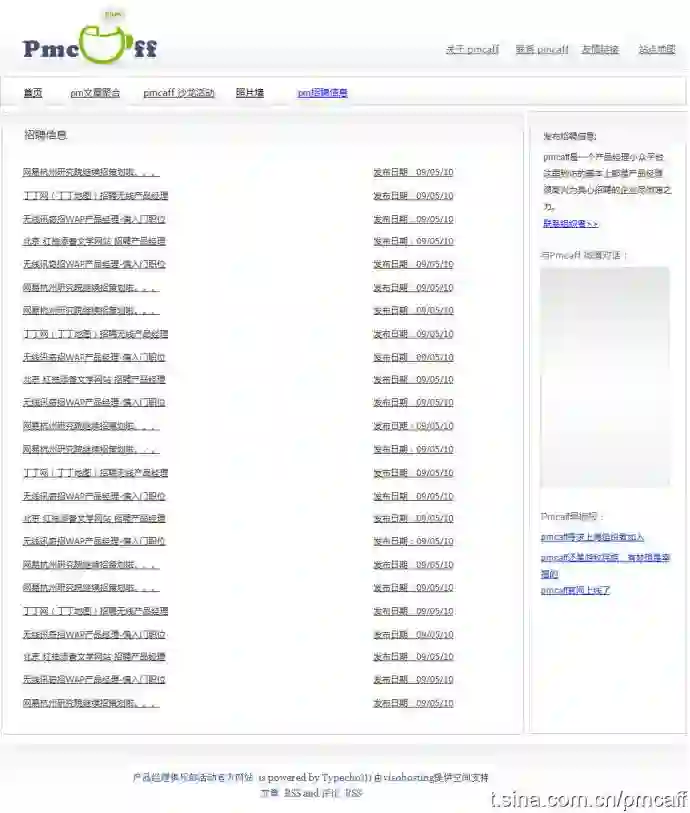 为了能把活动的内容整理出来和做一些活动通知,我们搭建了PMCAFF的博客。2009年各大互联网公司开始大量招揽人才,其中产品经理也包括在内,于是这个论坛还承担起了产品经理行业招人的任务。我自己在新浪的时候招PM也会去上面发JD,有一次竟然收到了两百多封简历。