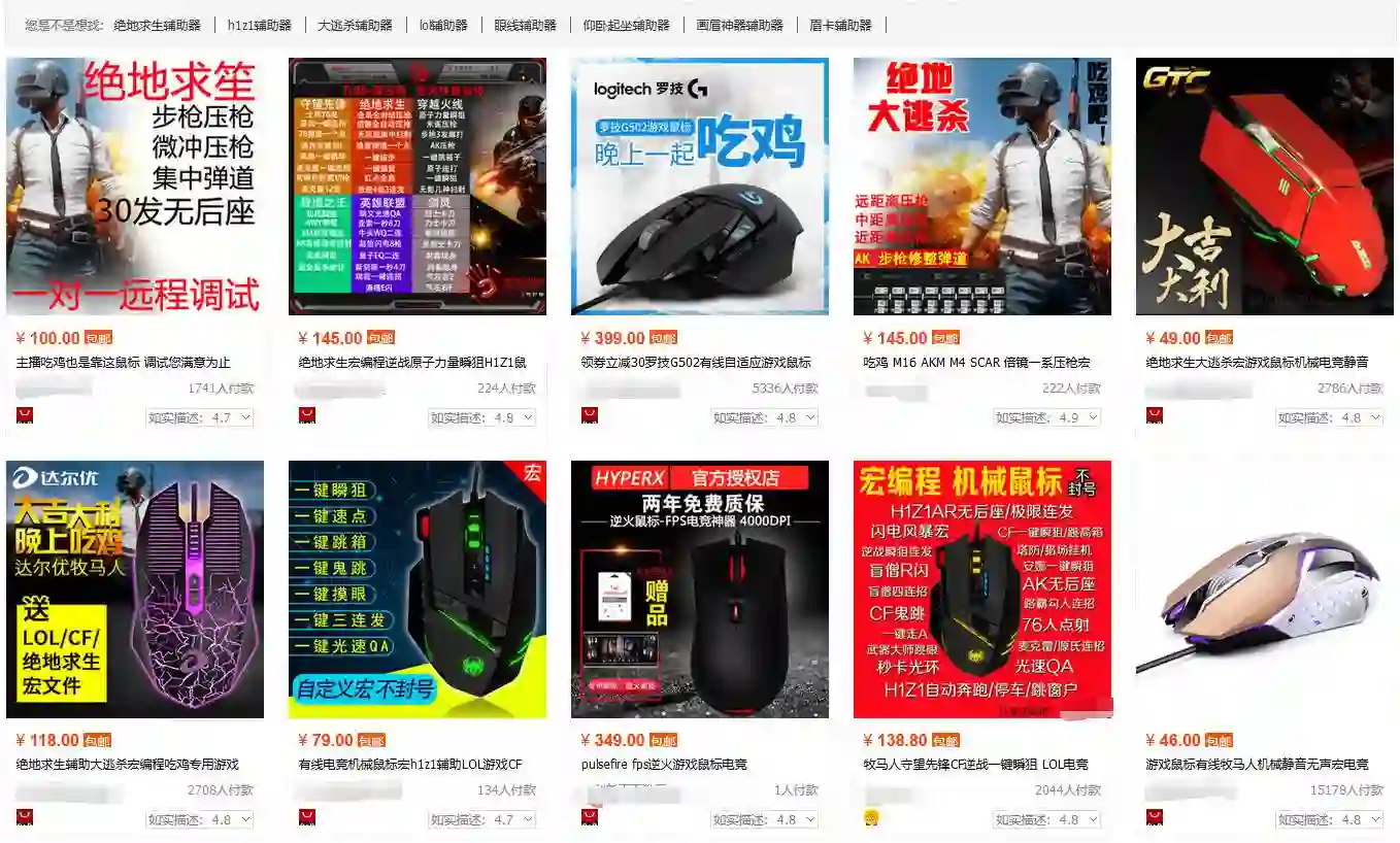 因为官方做了限制,在淘宝平台搜索外挂相关词汇所指向的通常是改装的硬件产品。鼠标还是那个鼠标,但已经预装了自动压枪、一键跳窗等宏命令,部分天猫加盟店也做起了这笔生意,评价内容还都不错。