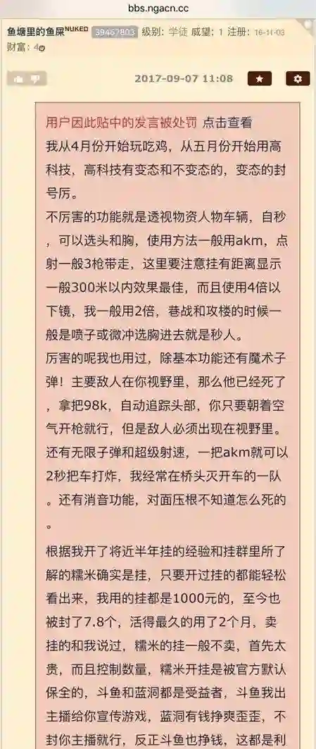 NGA论坛用户“鱼塘里的鱼屎”自曝了自己近半年来使用外挂的经历。