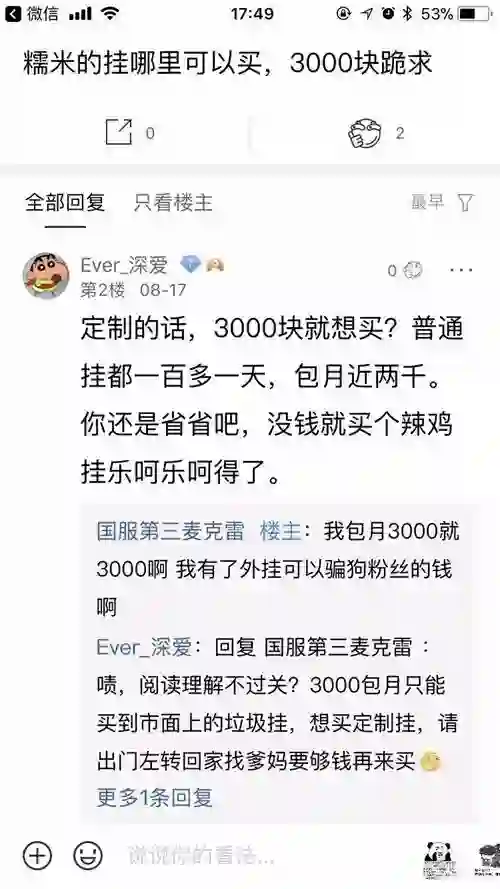 绝地求生贴吧里,一位吧友发帖悬赏3000元现金求糯米外挂购买方式,却遭到了楼下网友的无情嘲讽:“3000块就想买定制挂?还是省省吧,买个垃圾挂乐呵乐呵得了。”