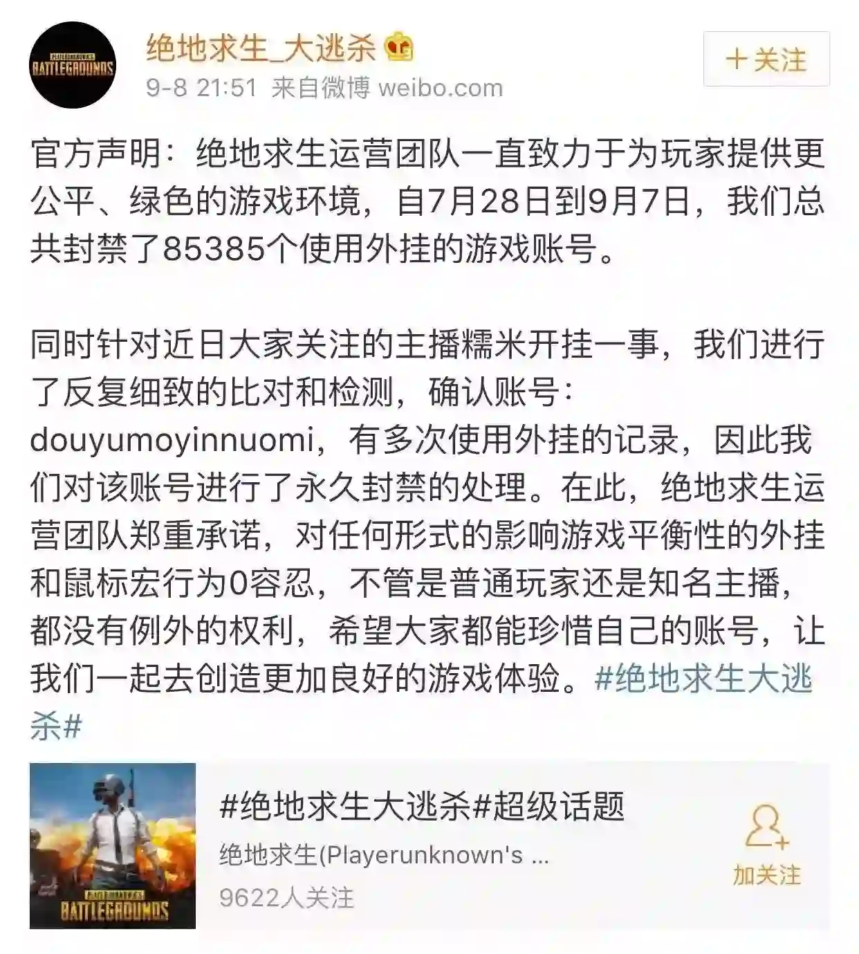 9月初,就在《绝地求生:大逃杀》游戏处于高歌猛进的阶段时,发生了一件令“吃鸡”玩家扼腕叹息的大事件:斗鱼主播魔音糯米与电竞元老人物黄旭东针对外挂问题的线下约架,被游戏厂商蓝洞截胡了。