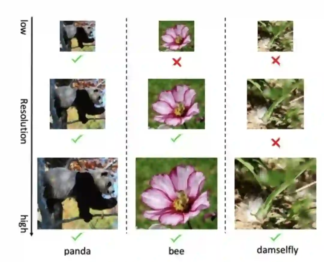 作者用预训练好的ResNet50测试了一些不同分辨率下的图像,并计算了每个样本正确预测所需的最小分辨率,如上图所示。“简单”样本 ,如前景明显的panda,可以在低分辨率和高分辨率下正确分类。
