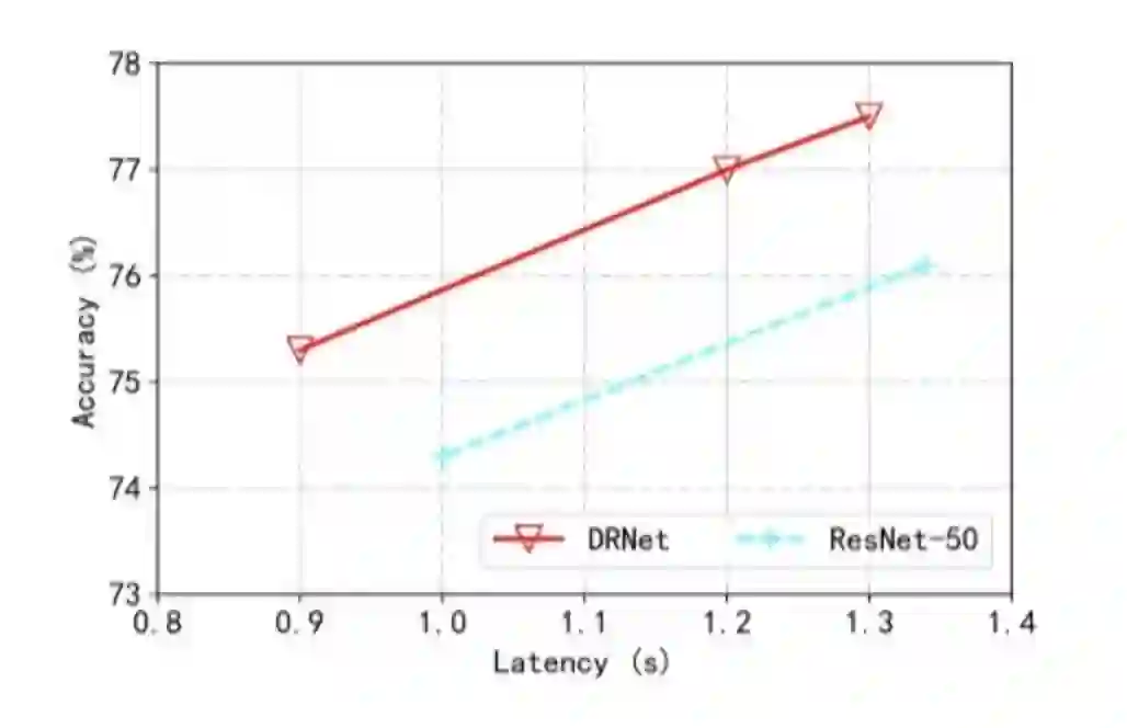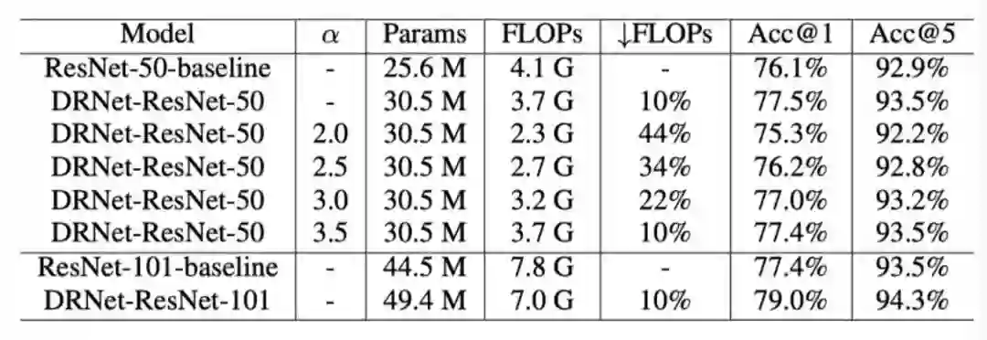 结果表明,本文的DRNet可以嵌入任何现成的网络结构中,从而大大降低计算复杂度。例如,与ImageNet上的原始ResNet-50相比,DRNet在计算量减少约34%的情况下实现了类似的性能,而在计算量减少10%的情况下,DRNet的精度提高了1.4%。
