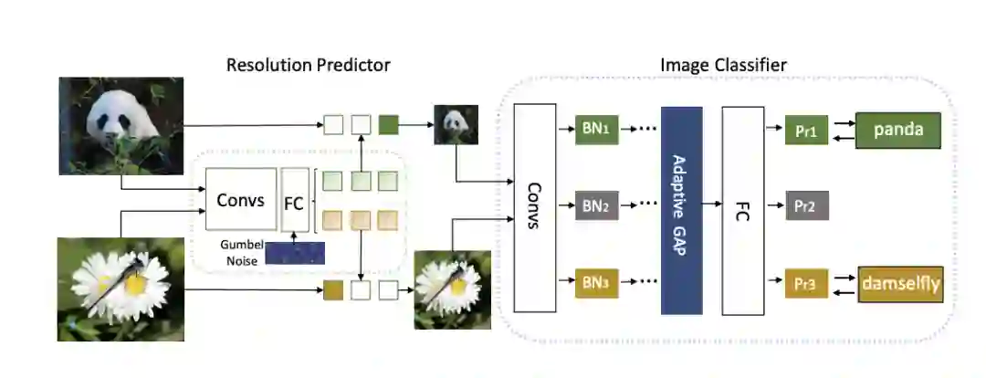 对于输入图像 X, 首先将其调整为 个候选分辨率, 如 。然后使用 分辨率预测器来输出每张图片的分辨率概率向量 , 并使用Gumbel-Softmax trick将软分辨率概率 转换为 one-hot形式 。根据 来选择相应大小的图像:
