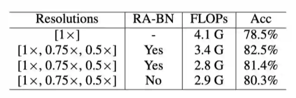 对于训练和测试过程,分辨率预测器首先做出决策,然后将具有选定分辨率的输入图片送入分类网络中。由于在一个Batch中有m种分辨率,作者将一个大Batch划分为m个小Batch。不同BatchNorm层处理不同分辨率的样本,这样,每个BatchNorm层只需统计每个分辨率下对应的样本数即可。