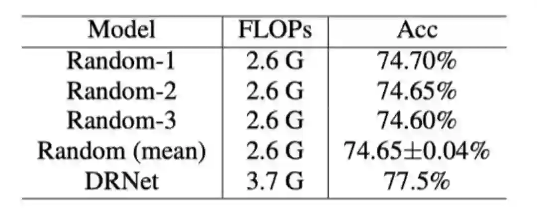 为了验证动态分辨率的有效性,作者采用了随机分辨率进行了实验,如上表所示,可以看出DRNet的性能比他们更高(不过这里计算量也更高)。