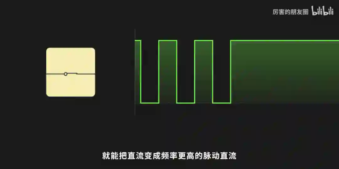 如果改变不了发电机,那就只能改变自己。第二代充电器就是在充电器的内部把电的频率升高了,交流电的频率的确没有办法提升,但是直流可以,只要在电路上加一个开关,控制开和断,就能把直流变成频率更高的脉动直流。