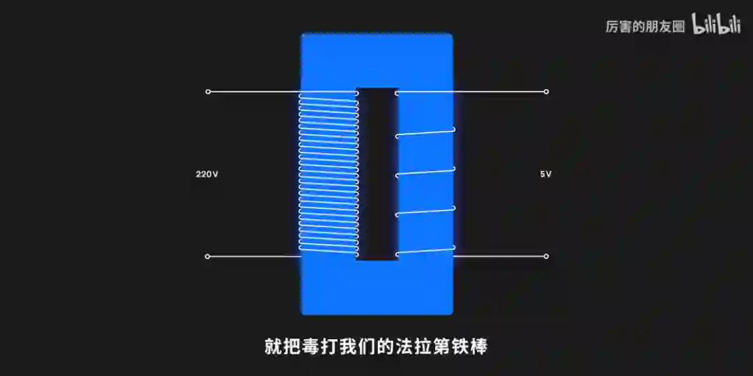 通电的导线缠绕铁棒会产生磁场,变化的磁场也可以产生电,如果我们把 220V 的电压在铁棒上缠一圈线圈电压是 220V,缠两圈每一圈就会变成 110V,而缠绕 220 圈的话,每一圈就是 1V,这个时候铁棒会形成磁场,如果我们再来一根铁棒靠近它缠绕一圈,那么这个变化的磁场就会传导变成电能,同样一圈就是 1V,如果缠上 5 圈就可以获得手机能接受的 5V。