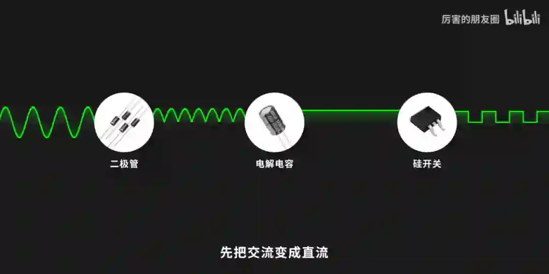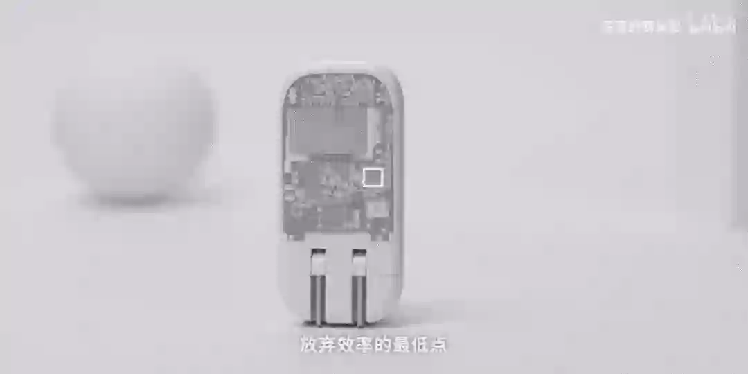 开关的速度就决定了电的频率,所以在市电进入充电器时,先加一道整流滤波的过程,先把交流变成直流,再通过半导体的硅做开关,升高频率到 5 万次,相比于市电的频率整整提升了 1000 倍,搬运电的频率提高了,作为搬运工的变压器和电容就可以变小了。