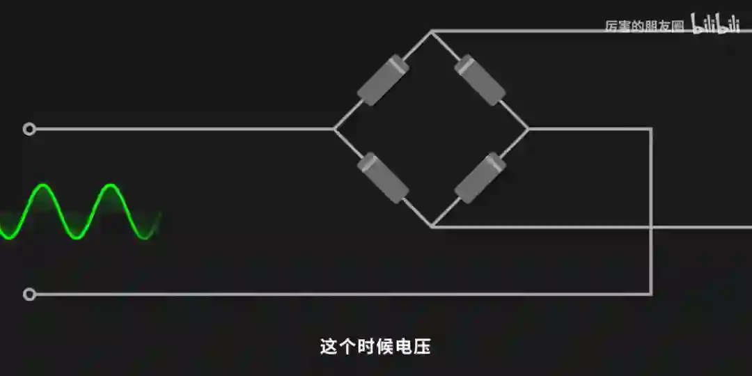 我们手机的电池不能储存这样波动的交流电,刚好就需要 4 根二极管,这种只能单向导电的工作特性,就能把下弦翻转成上弦。这个时候电压就变成了前浪和后浪彼此起伏的水流了。