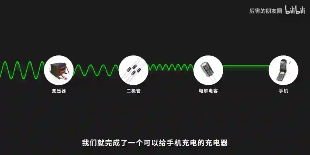 所以 220V 的交流电首先通过变压器变成了低压的交流电,再通过二极管变成前后浪脉动的直流点,然后经过「大水塘电容」变成低压平稳的直流电,至此我们就完成了一个可以给手机充电的充电器,但是相信我 2020 年的你绝对不想用它,因为大。