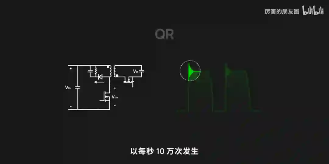 目前 75W 以下的充电器主要用的就是 QR 和 ACF 的电路架构,QR 架构氮化镓每次开关都有一部分的性能损耗,这样的损耗以每秒 10 万次发生带来的热量就非常大了,导致氮化镓开关的频率不能太高,同时也需要更大的面积去做散热,搬运电的速度就上不去,体积就没有办法变小。