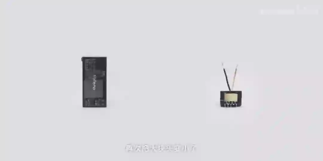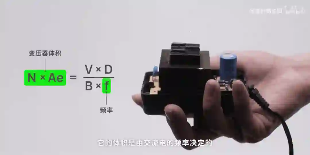 如果我们要拆开这样一个充电器,占体积最大的就是我们两个法拉第棒组合的变压器,它的体积是由交流电的频率决定的,为了更好的理解这个公式,假如手机需要的电是一桶水,相同的时间搬运 50 次,需要的容器就很大,如果搬运 100 次,那么容器就会小一点,搬运电的容器主要就是占体积的变压器和电容,所以想要缩小充电器的体积,最重要的就是要提升你搬电的频率,但搬运的频率早就被发电时的 50Hz 决定了,第一代充电器的体积也就被决定了。