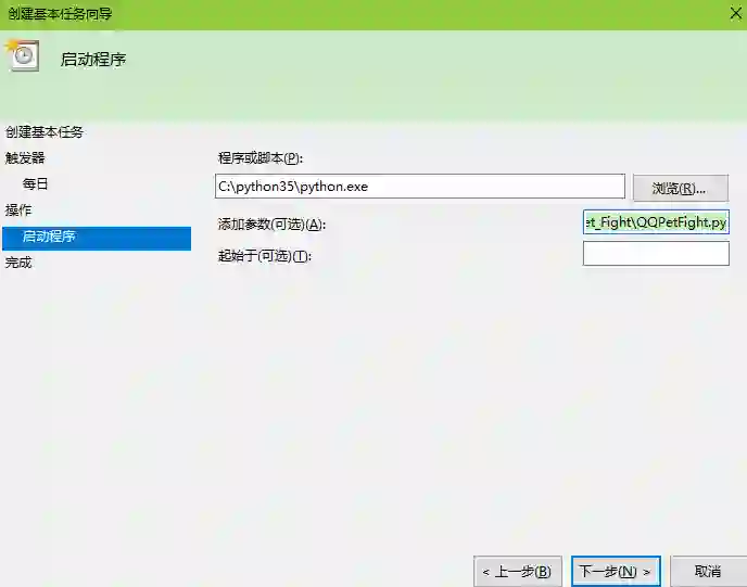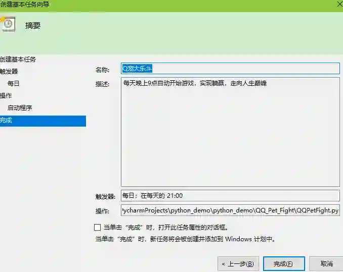 具体的计划任务教程,参考:Python与win的完美结合--计划任务。设置好时间,因为这个游戏的宠物是靠体力来进行的并且每天只能进行一次任务,所以每天定时打一次就可以了。
