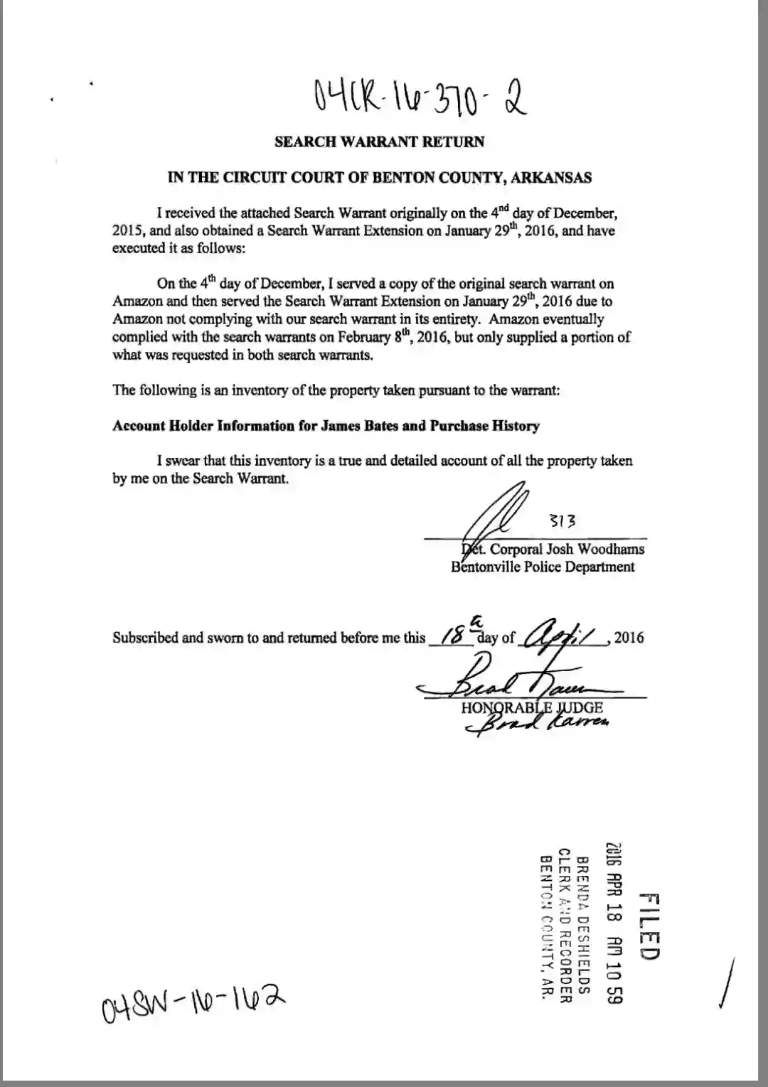 Amazon 的虚拟助理 Alexa 可能是一起谋杀案的“目击者”。(2015 年 11 月被害人 Victor Collins 被发现陈尸在 James Andrew Bates 家中的浴缸,当局以一级谋杀罪起诉了肯色州的 James Andrew Bates。警方认为是 James Andrew Bates 在家中勒死了 Victor Collins,但 Bates 对警方的指控不认罪。而热销于当年的 Amazon 家的 Echo,意外成为了家中唯一证人。因为 Echo 的智能助理 Alexa 会通过内置的七个麦克风接收环境中的声音,这些声音被上传云端并保存下来,警方认为 Amazon Echo 可能录到了犯案当时的关键证据,因此 Echo 成为唯一且最关键的“证人”。警方立即向 Amazon 发出了搜查令,要求 Amazon 提供云端保存的来自 Bates 家 Amazon Echo 上传的声音数据。)