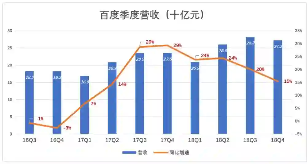 2016年百度季度营收一度出现负增长,2017年Q1开始回升,现已连续7个季度保持两位数增长。