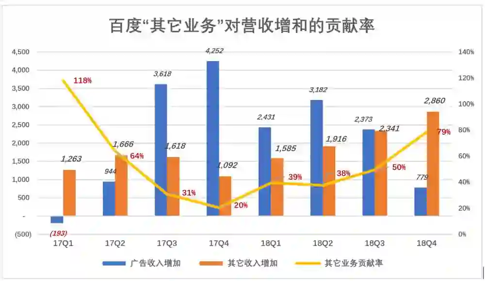 百度正在逐步改变收入来源单一的境况,2019年广告收入占比大概率降至80%以下。