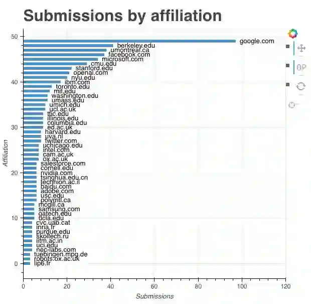 各大机构投稿论文数量,谷歌最多,有近100篇,其次是伯克利。