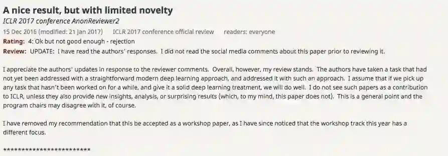 一名评审委员在Open Reiview ( https://openreview.net/forum?id=BkjLkSqxg¬eId=BkjLkSqxg)上对这篇论文的点评是: 我不认为这种论文对ICLR有任何贡献,除非他们还能提供新的见解,分析或令人惊讶的结果(在我看来,本文并没有)。这是我的总体观点,当然程序主席可能不同意。我已经撤销了推荐该论文进入workshop的建议,因为我注意到今年的workshop有不同的重点。