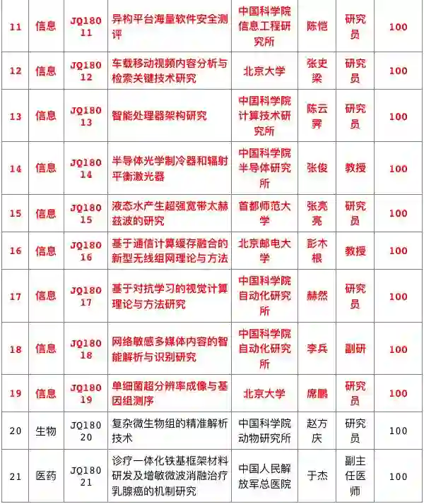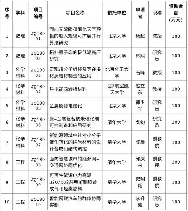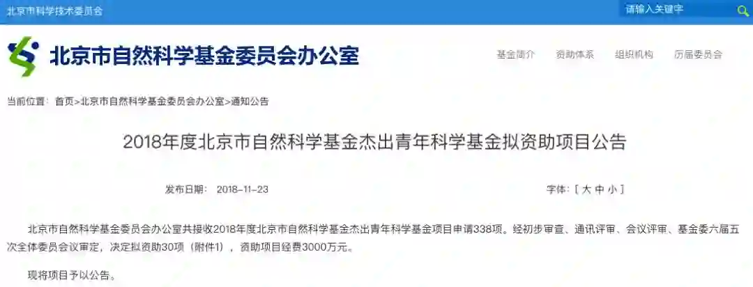 23日,北京市自然科学基金委员会办公室正式发布2018年度北京市自然科学基金杰出青年科学基金拟资助项目公告,决定资助30个项目,项目资助期限为3年,资助强度100万/项,总计3000万元资助项目经费。