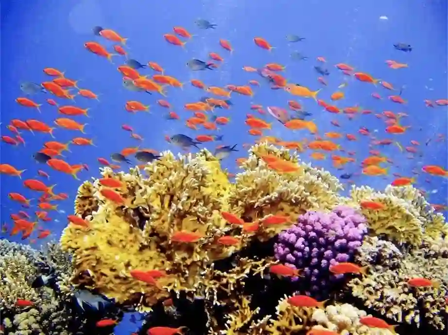 这张照片里的珊瑚礁欣欣向荣、色彩斑斓,周围聚集了大量的鱼虾贝藻和其他生物。它被誉为海底热带雨林,它的生物多样性之高也令人惊叹。