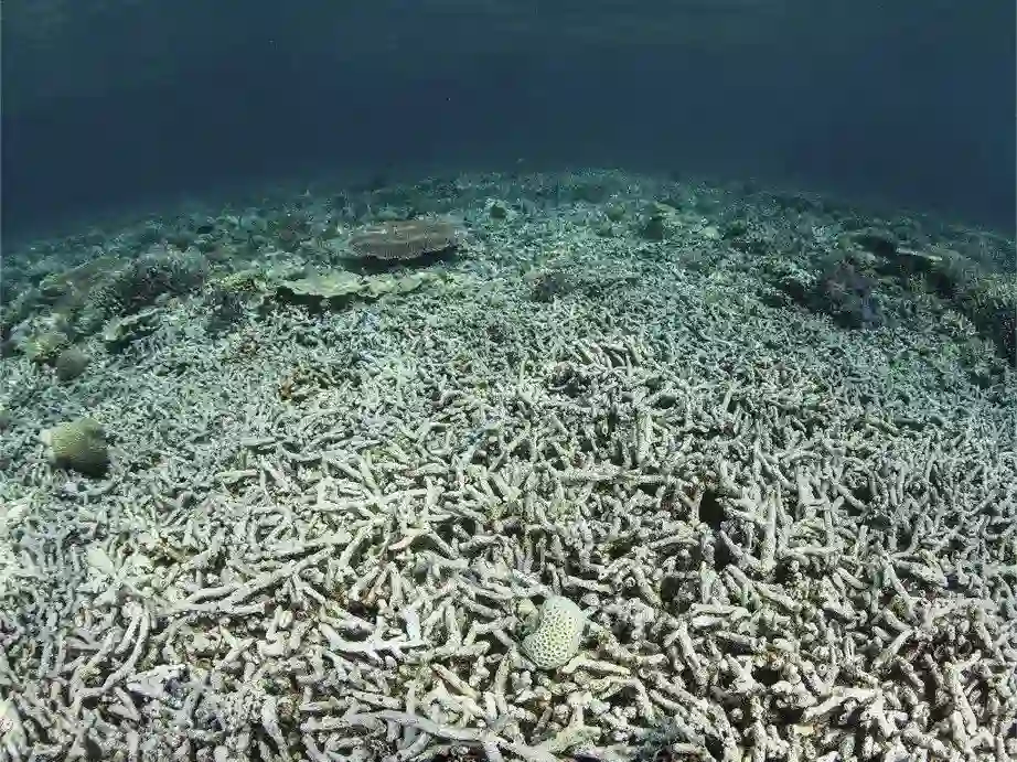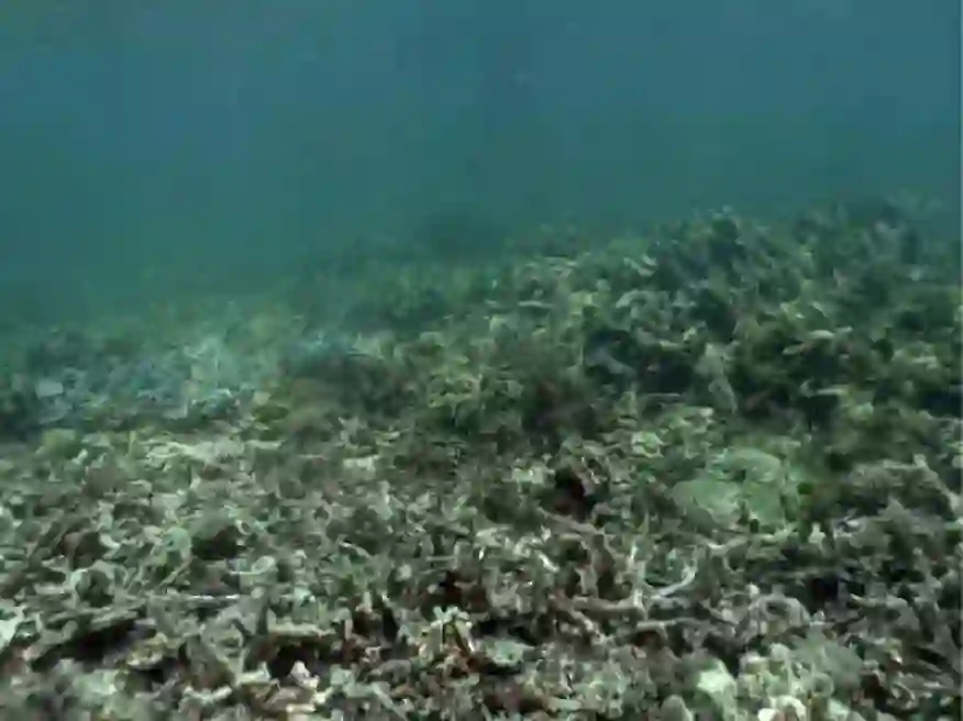 这张照片里的珊瑚礁一片死寂,鱼啊、虾蟹啊都已经看不到了,很惨,但这就是现在珊瑚礁的现实。