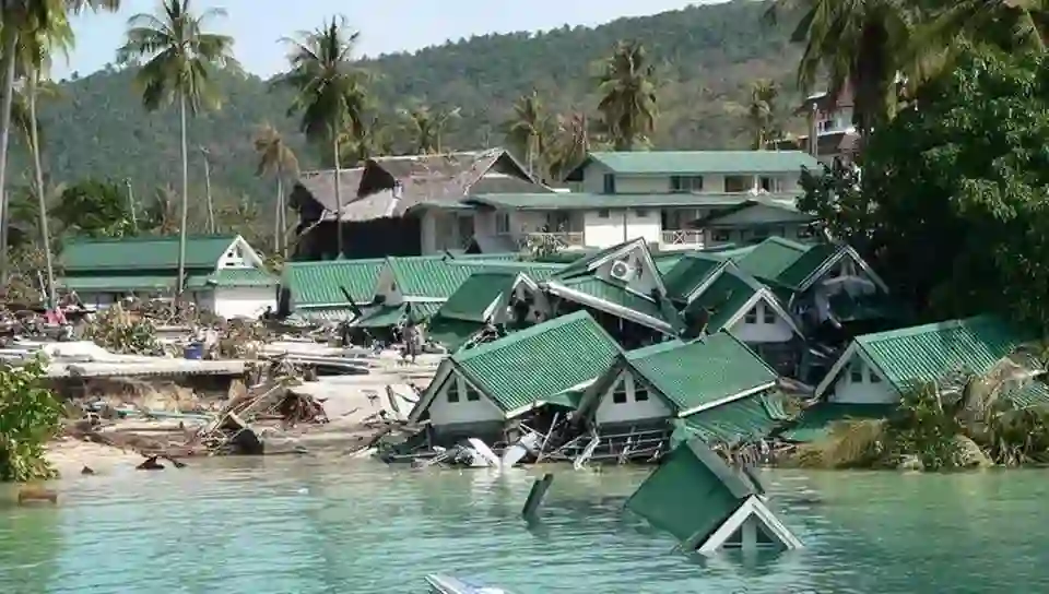 这个图片是印度洋的一处沿海城市。由于近海的珊瑚礁被破坏殆尽,无法对海上灾难形成削弱,当海啸来临时,这座城市也就失去了珊瑚礁的缓冲和保护,只能被毁得一塌糊涂。