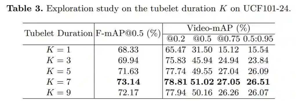 我们改变输入长度进行探究,发现K=1时,MOC变为一个frame-level的detector,效果差了很多尤其是video mAP,验证了tubelet detector确实效果更优。并且发现K=7的时候效果最好,在MOC模型中我们设置K=7。