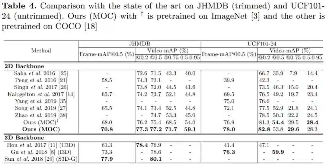 我们将MOC和其他方法的结果在UCF101-24和JHMDB上进行对比,[23. 19. 24]都是frame-level的detector,[12, 32, 35, 25]是tubelet-level的detector,我们的方法均优于这些方法,尤其是对于high IOU video mAP,可见我们的anchor-free tubelet detector MOC可以比anchor-based tubelet detector更精确地从短时序视频片段中定位动作。我们和基于3D backbone[9, 7, 27]的方法效果差不多,这些方法通常将action detection分为两个步骤,person detection (ResNet50-based Faster RCNN pretrained on ImageNet) 和action classification (I3D/S3D-G pretrained on Kinetics+ROI pooling),和tubelet detector相比无法提供一个简单的框架。