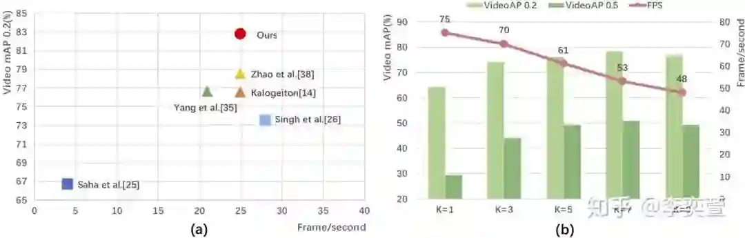 根据ACT,不加光流计算时间,MOC双流K=7可达到25fps,在左侧的图中,我们将MOC和在原论文中报了自己速度的方法进行对比,其中[14, 35, 38]都是tubelet action detector,我们发现MOC效率高而且准确率也高。我们的MOC也可以用于处理在线视频流。对于视频流,MOC只使用之前的K-1帧和当前帧作为输入,由于每帧的特征只需提取一次,我们将之前K-1帧的特征保存在缓冲区中。当一个新的帧到来时,MOC的backbone会立即提取出它的特征,总共K帧的特征会由MOC的三个分支联合操作产生K帧的tubelets,link算法立即将这些tubelets和之前的结果连接得到视频级别的检测结果tubes,单流RGB速度达53FPS。