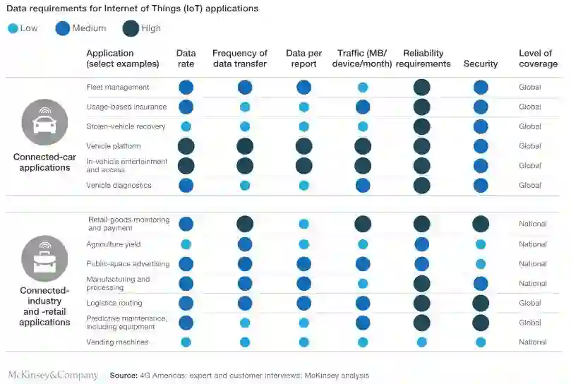 例如,考虑联网汽车领域的要求,其中一家公司可以提供多种物联网应用,包括车队管理,车载娱乐和失窃车辆追回(图表3)。每个用例对速率、传输频率和每个报告的数据都有不同的要求。但是,所有用例都需要相同程度的可靠性,安全性和覆盖范围。相比之下,工业和零售应用程序通常具有截然不同的数据要求,以及对覆盖范围,可靠性和安全性的不同需求。
