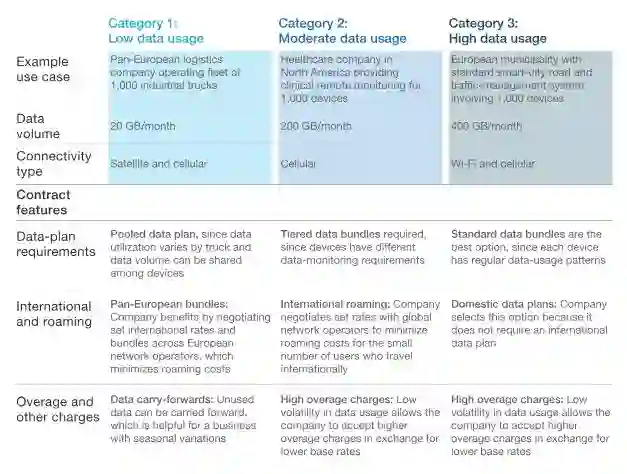 创建定制的定价方案可能看起来任务艰巨,但是可以通过一个简单的方案实现。第一步,公司应确定员工如何在其组织内使用物联网设备,以及客户如何使用其支持物联网的产品。在此分析过程中,他们应关注最重要的用例,这些用例可能与内部操作,客户需求或两者相关。然后,公司可以根据数据需求(低、中、高)将其组织分为三类。漫游和连接要求以及对超额保护的需求可能会在每个类别中有所不同,如图表2所示。