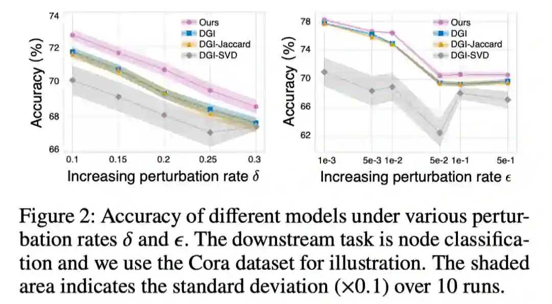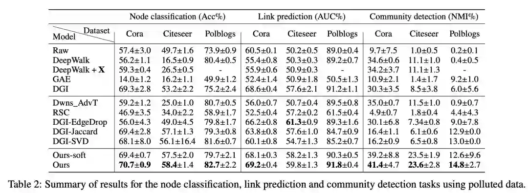 不同下游任务中模型的对抗鲁棒性:如表2所示,文章提出的模型在节点分类、链接预测和社区识别任务上分别比最优基准方法平均高出了+1.8%、+1.8% 和+45.8%。