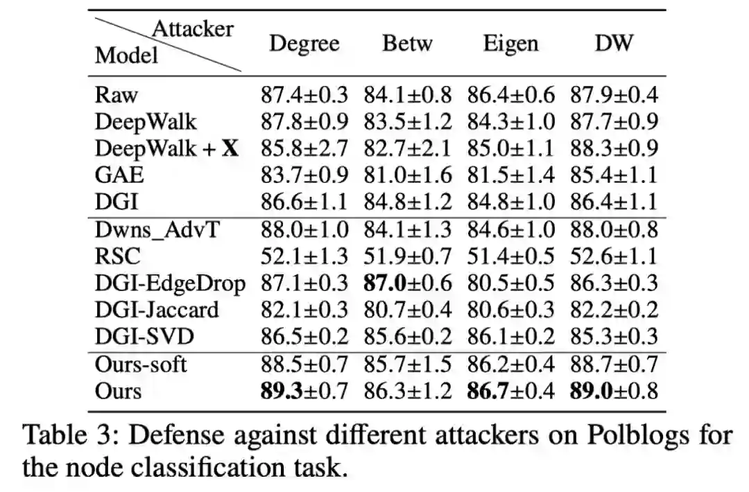 表2:节点分类、链接预测和社区识别任务中的对抗鲁棒性