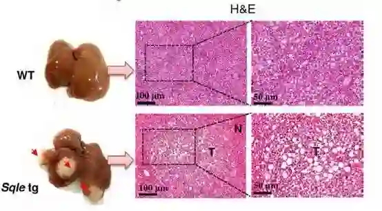 SQLE编码一种单加氧酶,是胆固醇生物合成中的第二种限速酶。由于肝脏胆固醇积累是NAFLD发生的基础,研究人员假设SQLE可能在NAFLD-HCC中起关键作用。然而,SQLE在NAFLD-HCC中的病理作用尚不清楚。这里研究人员评估了SQLE在正常肝脏和NAFLD-HCC细胞系中的致瘤作用,并开发了肝细胞特异性Sqle转基因小鼠(tg)以评估其对体内NAFLD-HCC发展。