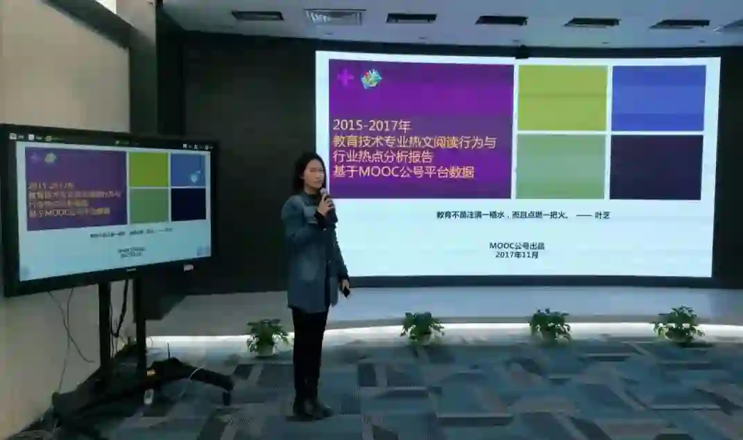 董玥昕以基于MOOC公号平台的数据,做了《2015-2017年教育技术专业热文阅读行为与行业热点分析》的演讲报告。MOOC公号(ID:openonline)成立于2013年,是目前国内教育行业最早、最垂直、专业化程度最高的在线教育和学习(MOOC、SPOC、MPOC等)的理论和实践的研究、交流、开放开源基地,探讨构建未来学习平台和未来教室创新方案,实践未来教育的模型、入口和操作系统——新维空间站。致力于为中国以及全球教育进步的思考者与实践者,提供一个智慧集聚、分享思想、结识同道、共同实践的开放开源平台。董玥昕从发布地域、机构、专家、科研人才以及教育科技“研究热词”等方面做了详细的讲解,MOOC公众号基于对2015-2017年发布的教育技术核心期刊论文进行统计:共发布论文633篇;发文机构257所;科研人才801位;集中分布5个地域:北京、上海、江苏、浙江、湖北;集中分布5所高校:北京师范大学、华东师范大学、华中师范大学、华南师范大学、东北师范大学;教育科技研究热词1852个。其中,2015-2017上半年教育科技研究热词TOP10分别为:MOOC、 创客、教育信息化、学习分析、翻转课堂、互联网+、大数据、教学设计、在线教育、 STEAM。