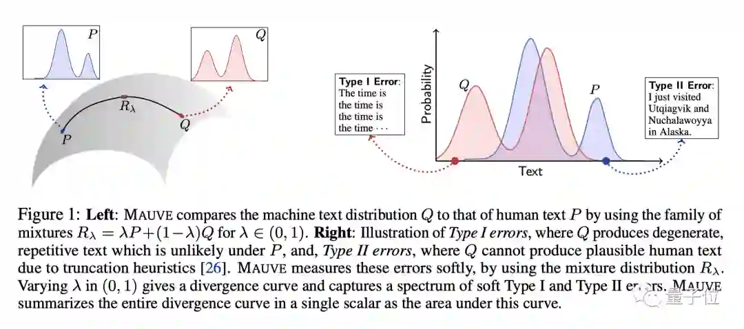 本出提议的MAUVE度量本质上是对连续度量系列的集成,目标是捕获I类错误(生成不切实际的文本)和II类错误(不捕获所有可能的人类文本)。