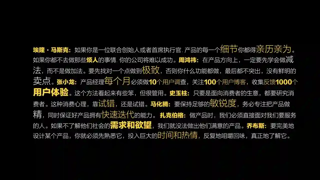 我准备了很长时间,找了世界上最牛逼的产品经理——比如埃隆·马斯克、乔布斯等,去看他们是怎么讲产品的。