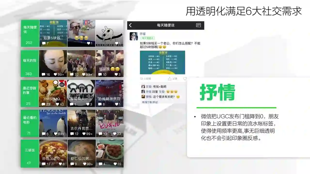 最后我们发现,是“抒情”——人类的一种本质需求:动物和动物的对话,人类的对话中需要有一种情绪的表达。用一个词来说就是“无病呻吟”——被朋友圈做到极致的需求: