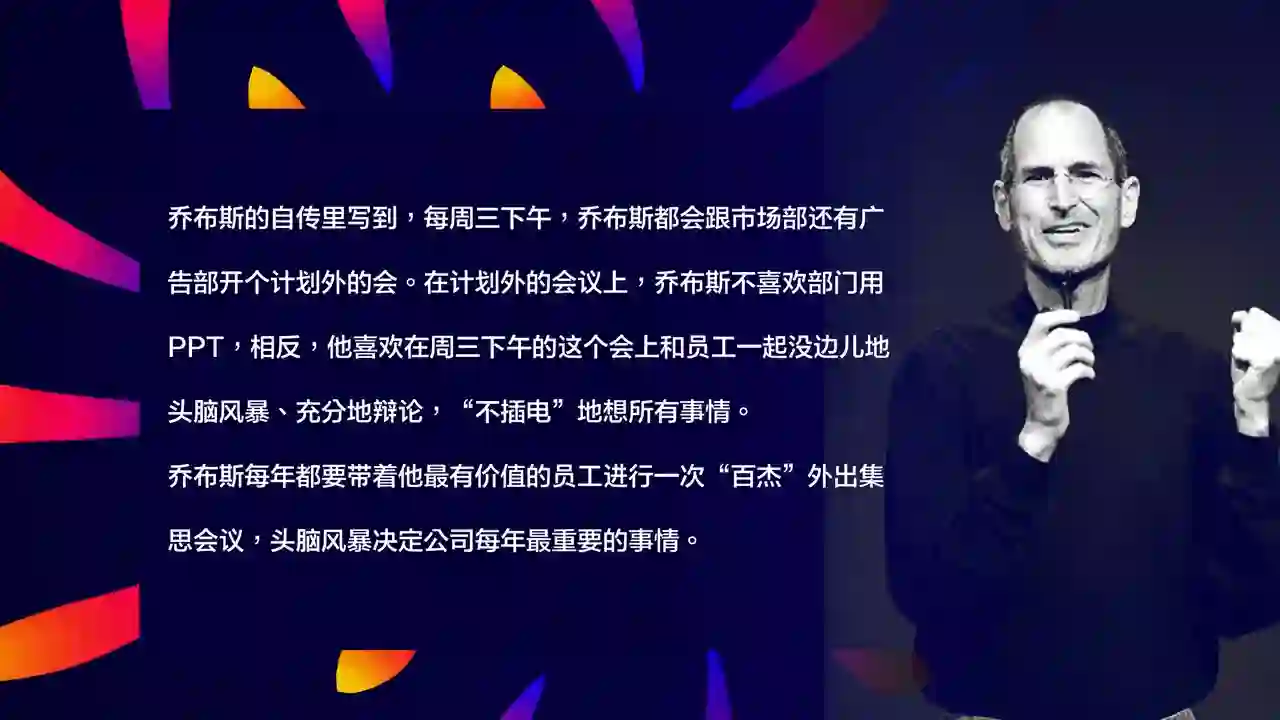 乔布斯最喜欢做这种事情——他把诗人、摇滚乐手、产品经理、技术、教授这些人扔到一块,做各种头脑风暴——