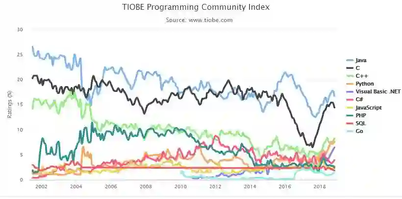 TOP 10 编程语言 TIOBE 指数走势(2002-2018)