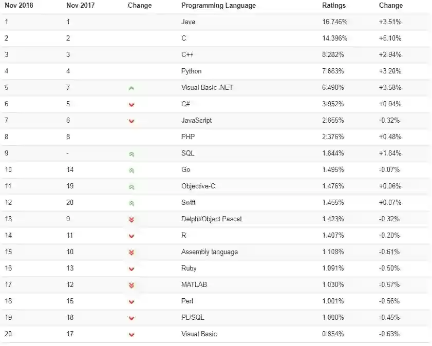 当然,今年也有出现了一些新的编程语言,但它们的普及率太低,暂未称得上“年度编程语言”的称号。例如,上个月,Apex 从第 46 位跃升至第 36 位,而 Alice 则在同一时期从第 62 位跃升至第 44 位。但是这些都不重要,因为两种语言在 2018 年的增幅都不到 0.5%。哪门语言会获胜?我们不妨拭目以待。