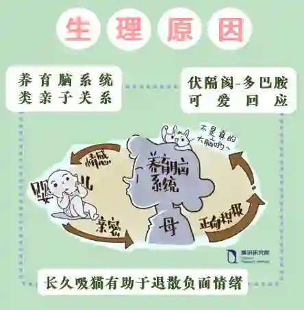 养育脑理论由科学家Parsons等人在2010年提出,Swain在 2011强化了这个理论。这个理论是指人类母亲对婴孩之间存在的一种亲密无间、正向积极的感情,正是因为养育脑系统的参与。猫咪的“婴儿图式”(Babyschema)长相激发单身青年们的“养育本能”,刺激人类大脑的快乐中枢分泌多巴胺,让人们从内心感到有了猫,就有了全世界。