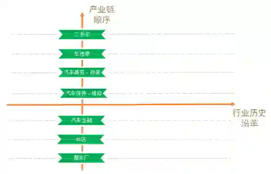 下面是我整理的关于汽车行业的一个简略图,Y轴为汽车行业的产品链,X轴为这些产品的发展史。