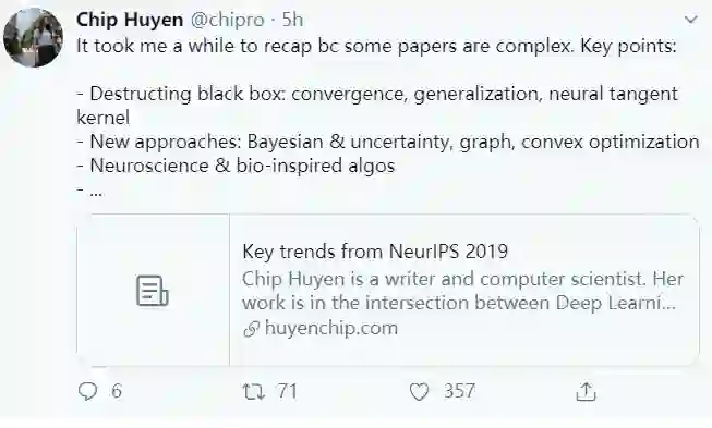 【导读】今年 8 月份,毕业于斯坦福、现就职于英伟达人工智能应用团队的 Chip Huyen 撰写了一篇博客,讲述她对NeurlPS2019的观感,讲述了研究热点与发展趋势,感兴趣的三个方向是: 贝叶斯学习、图神经网络和凸优化,来看下。