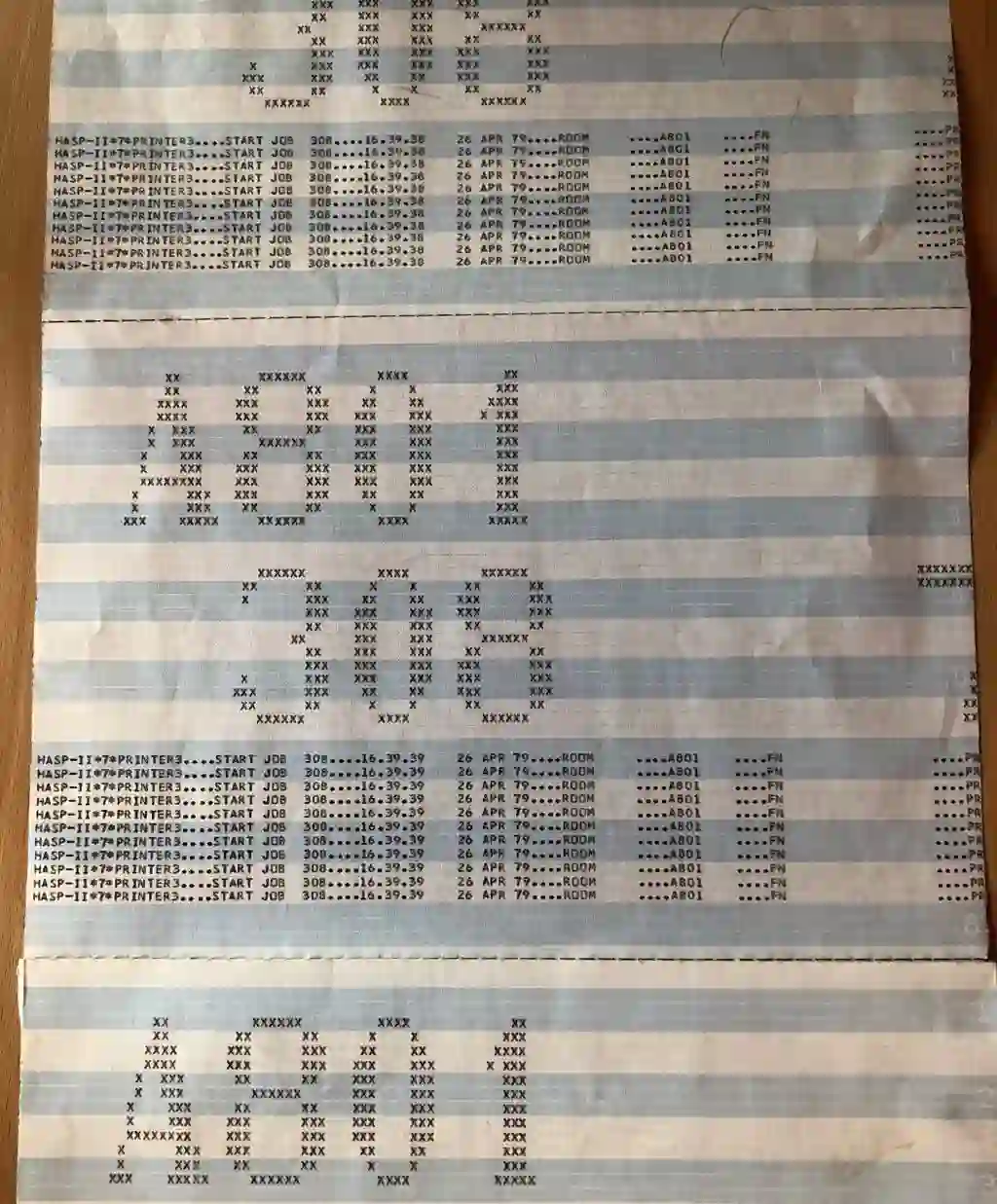 刚开始的时候,程序很小,但后来可能会装满几米长的卡片盒。每一行代码都变成了一张穿孔卡。每行一条指令。打孔部门将程序(数千张卡)返还给我们。我们还必须创建“控制卡”,其编码包括穿孔卡是否要编译或执行以及它是什么语言等等。控制卡有一个单独的颜色。第一张卡片是工作卡,上面有我的名字,所以他们知道该把东西还给谁。