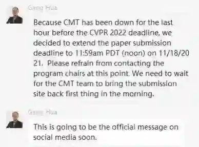 随后,CVPR Program Chair华刚博士发出消息:「由于CVPR的CMT在CVPR 2022截止日期前的最后一个小时已经停工,我们决定将论文提交截止日期延长至太平洋夏令时2021年11月18日中午11:59。现在先请不要联系Program Chair。我们需要等待CMT团队早上把提交网站修复。」