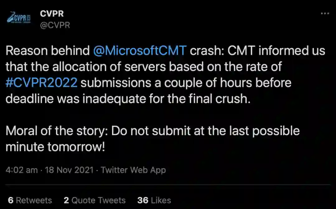 接着,CVPR公布了MicrosoftCMT崩溃背后的原因:「CMT通知我们,截止日期前几个小时CVPR 2022的论文提交速率过大,服务器分配不足导致了最终的网站崩溃」。