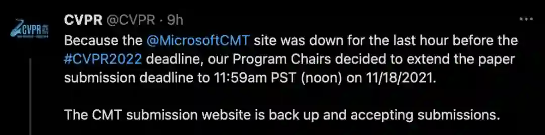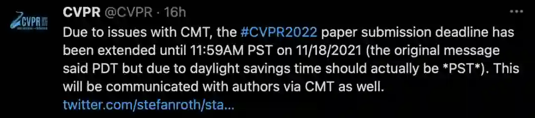 「由于与CMT的问题,CVPR 2022论文提交截止日期已延长至2021年11月18日太平洋标准时间上午11:59(原始消息称太平洋夏令时,实际上应为太平洋标准时间)。这一消息也将通过CMT与作者交流」。